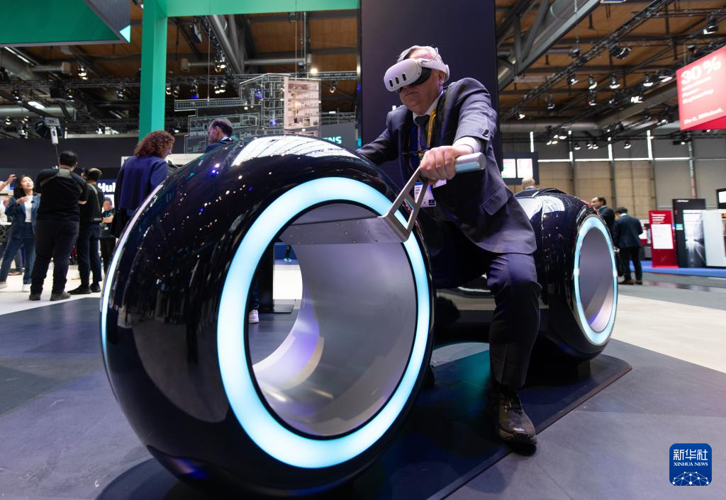 4月20日,一名男子在德国汉诺威工业博览会西门子展区体验一款VR设备。
