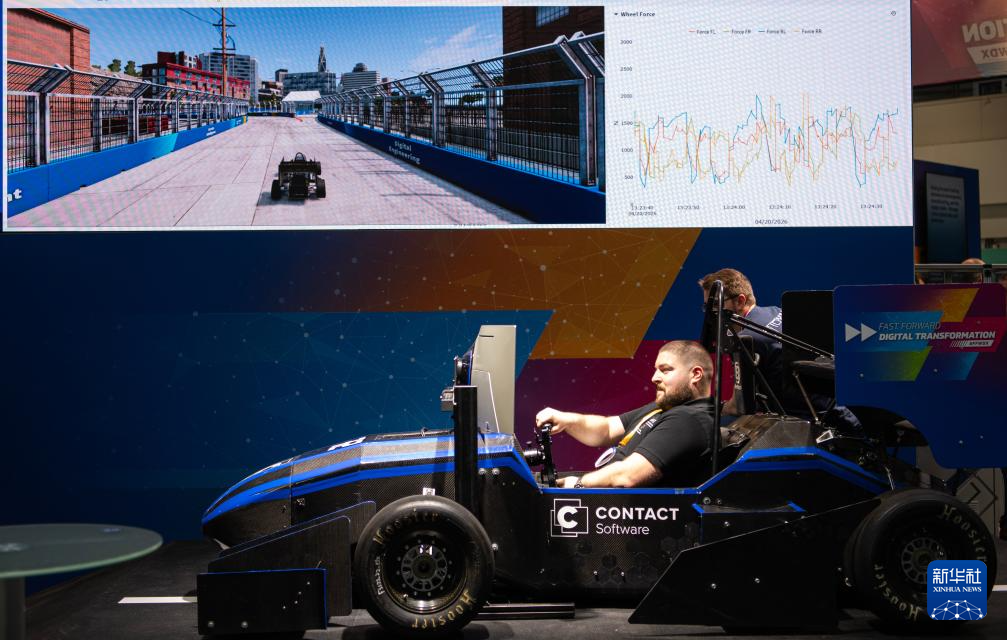4月20日,一名男子在德国汉诺威工业博览会体验一款赛车模拟设备。