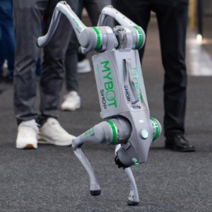 4月20日,人们在德国汉诺威工业博览会观看机械狗表演。