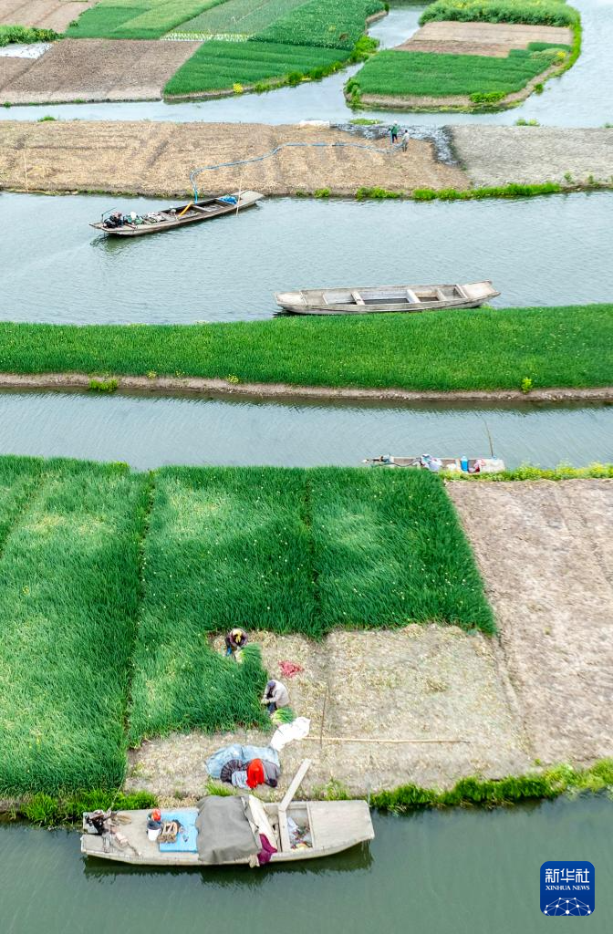 4月20日,农民在江苏省兴化市垛田街道杨荡村的田间收获香葱(无人机照片)。