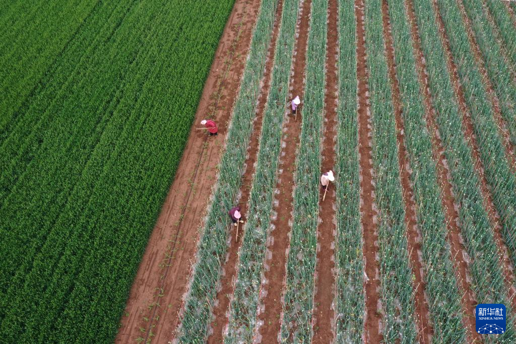 4月20日,在河南省沁阳市柏香镇葛前村,农民在洋葱种子田里中耕除草(无人机照片)。