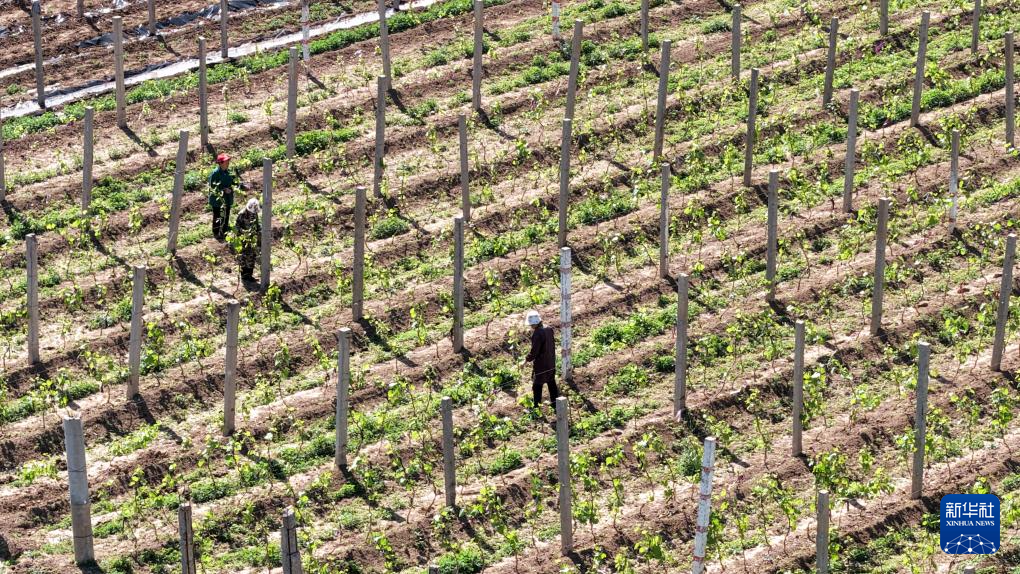 4月20日,在河北省石家庄晋州市周家庄乡,农民在葡萄园劳作(无人机照片)。