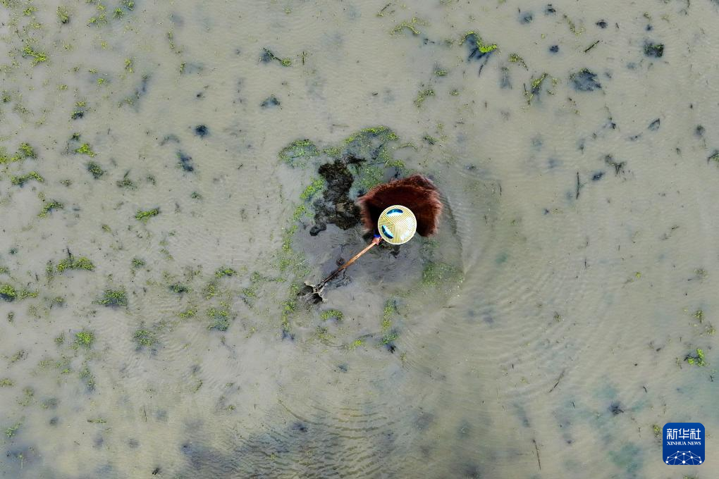 4月20日,村民在重庆市黔江区马喇镇杉树村整理水田(无人机照片) 。