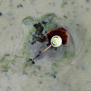 4月20日,在江苏里下河地区农科所(扬州市农科院)试验田,农民在田间劳作(无人机照片)。