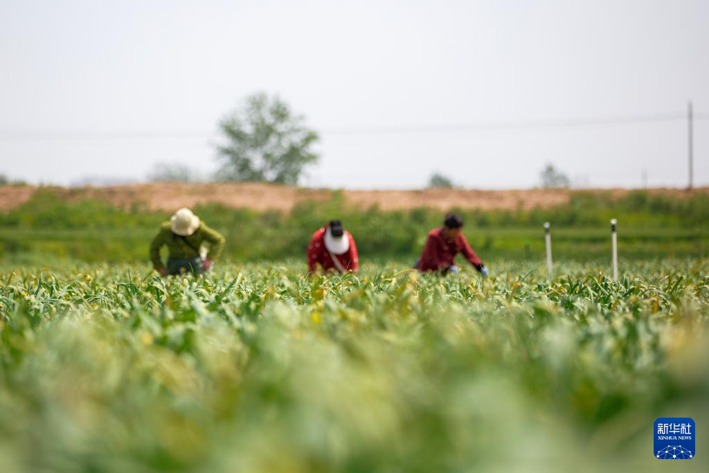 4月20日,在河南省商丘市睢县西陵寺镇一处农田内,农户在田间采收蒜薹。