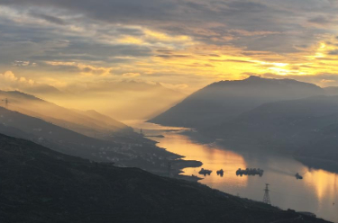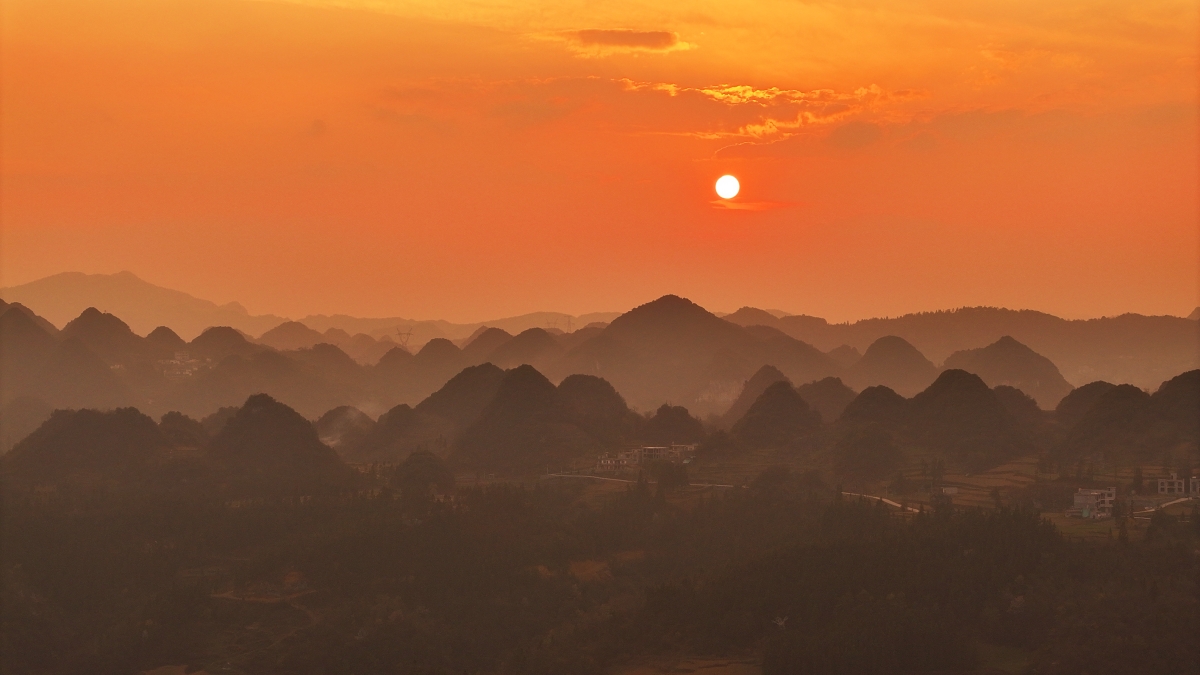 夕陽西下,在云南省昭通市鎮(zhèn)雄縣銀廠村,霞光灑落在烏蒙群山間,航拍視角下,峰巒連綿,山河壯闊,宛如一幅氣勢恢宏的水墨畫卷。