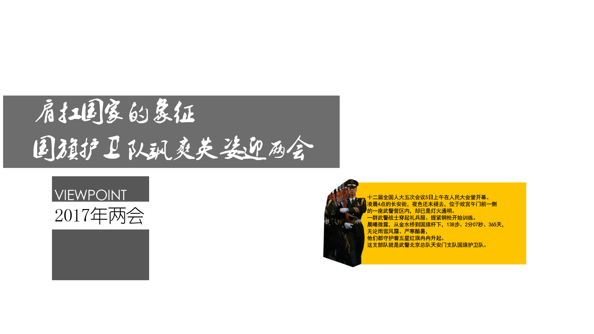 2017年3月5日,第十二屆全國人民代表大會第五次會議在人民大會堂開幕。凌晨4點(diǎn)的長安街,夜色還未褪去,位于故宮午門前一側(cè)的一座武警營區(qū)內(nèi),卻已是燈火通明。一群武警戰(zhàn)士穿起禮兵服、握緊鋼槍開始訓(xùn)練。晨曦微露,從金水橋到國旗桿下,138步、2分07秒、365天,無論雨雪風(fēng)霜、嚴(yán)寒酷暑,他們都守護(hù)著五星紅旗冉冉升起。這支部隊(duì)就是武警北京總隊(duì)天安門支隊(duì)國旗護(hù)衛(wèi)隊(duì)。
