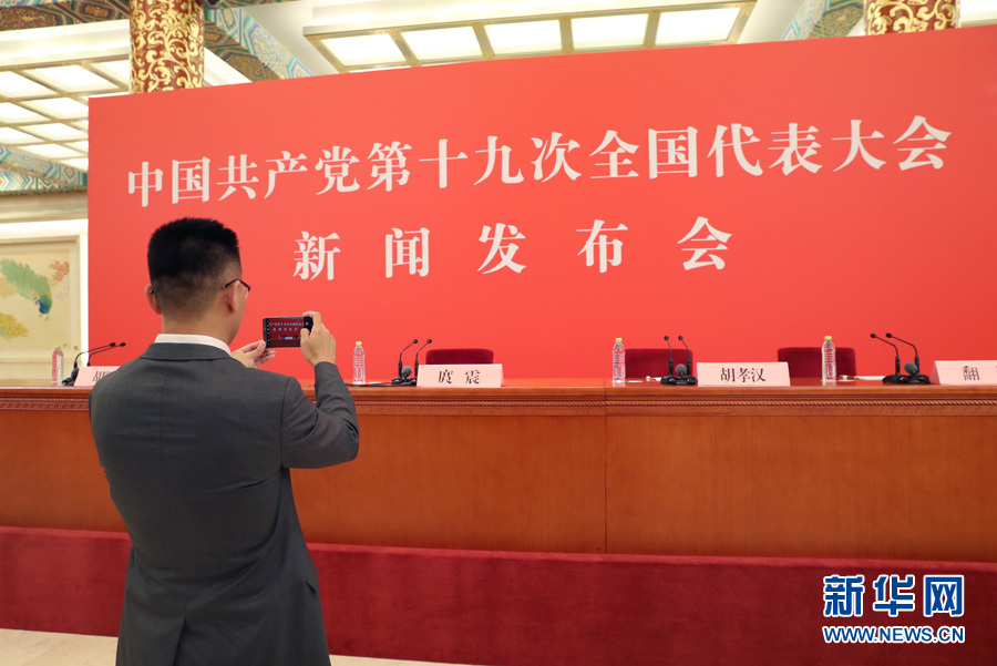 2017年10月17日下午,中國共產(chǎn)黨第十九次全國代表大會新聞發(fā)言人在人民大會堂三樓金色大廳舉行新聞發(fā)布會,并回答中外記者提問。圖為記者在新聞發(fā)布會現(xiàn)場拍攝。新華網(wǎng) 翟子赫 攝