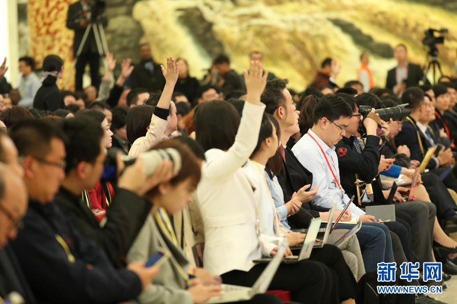 2017年10月17日下午,中國(guó)共產(chǎn)黨第十九次全國(guó)代表大會(huì)新聞發(fā)言人在人民大會(huì)堂三樓金色大廳舉行新聞發(fā)布會(huì),并回答中外記者提問(wèn)。圖為記者在現(xiàn)場(chǎng)踴躍提問(wèn)。新華網(wǎng) 翟子赫 攝