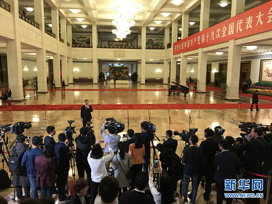 10月18日,十九大新聞中心在人民大會(huì)堂舉辦“黨代表通道”第一場(chǎng)采訪活動(dòng)。圖為采訪現(xiàn)場(chǎng)。新華網(wǎng) 翟子赫攝