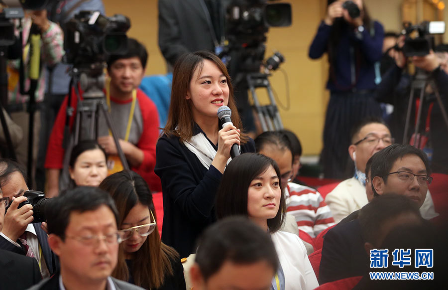 10月21日,十九大新聞中心舉辦記者招待會(huì),邀請(qǐng)中共中央統(tǒng)戰(zhàn)部常務(wù)副部長張裔炯、副部長冉萬祥,中共中央對(duì)外聯(lián)絡(luò)部副部長郭業(yè)洲介紹黨的統(tǒng)一戰(zhàn)線工作和黨的對(duì)外交往情況,并回答記者提問。圖為經(jīng)濟(jì)日?qǐng)?bào)記者提問。新華網(wǎng) 郝廣鵬攝