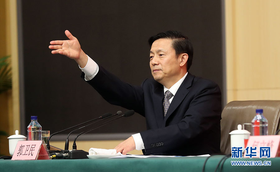 10月21日,十九大新聞中心舉辦記者招待會(huì),邀請(qǐng)國(guó)家發(fā)展改革委黨組書記、主任何立峰,副主任張勇,副主任寧吉喆介紹以新發(fā)展理念為引領(lǐng),推進(jìn)中國(guó)經(jīng)濟(jì)平穩(wěn)健康可持續(xù)發(fā)展有關(guān)情況,并回答記者提問(wèn)。圖為主持人郭衛(wèi)民。新華網(wǎng) 郝廣鵬攝