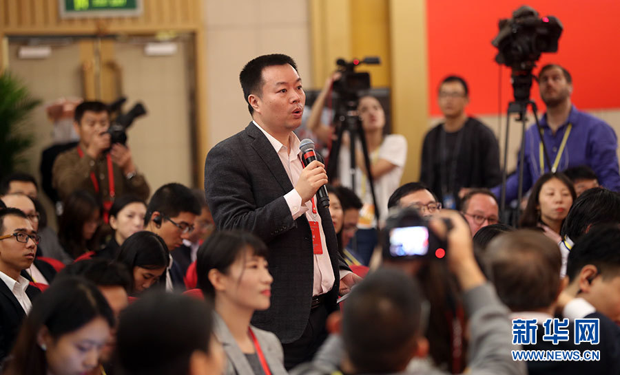 10月21日,十九大新聞中心舉辦記者招待會(huì),邀請(qǐng)國(guó)家發(fā)展改革委黨組書記、主任何立峰,副主任張勇,副主任寧吉喆介紹以新發(fā)展理念為引領(lǐng),推進(jìn)中國(guó)經(jīng)濟(jì)平穩(wěn)健康可持續(xù)發(fā)展有關(guān)情況,并回答記者提問(wèn)。圖為人民鐵道報(bào)記者提問(wèn)。新華網(wǎng) 郝廣鵬攝