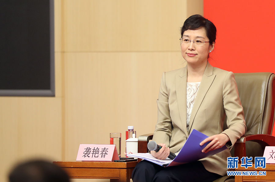 10月22日,十九大新聞中心在梅地亞中心二層新聞發(fā)布廳舉辦集體采訪活動,主題為“中國特色強軍之路邁出堅定步伐”。圖為主持人襲艷春。新華網(wǎng) 郝廣鵬攝