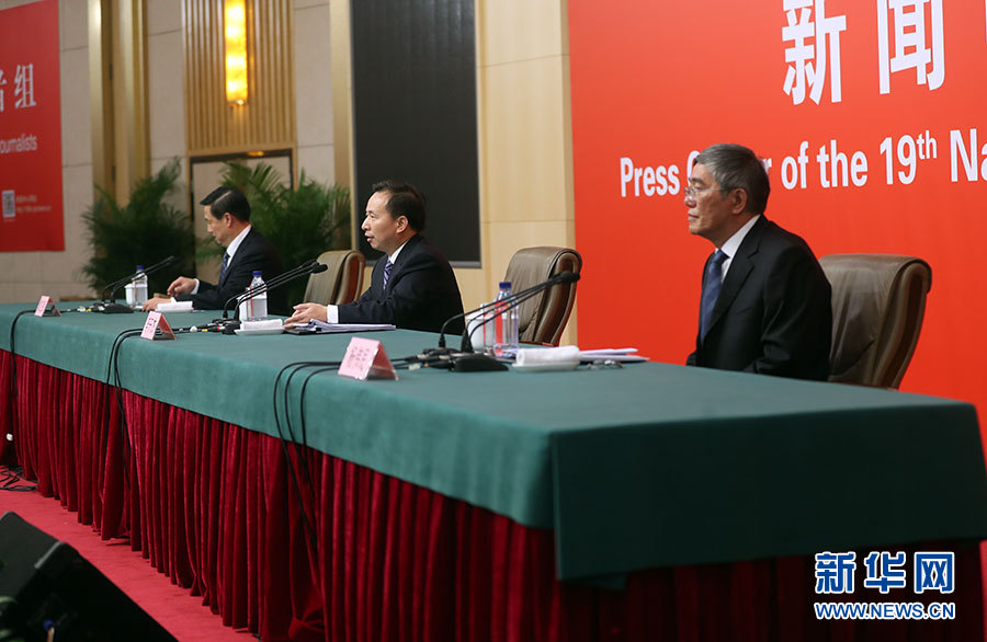 10月23日,十九大新聞中心舉辦記者招待會,邀請中央財經(jīng)領(lǐng)導(dǎo)小組辦公室副主任楊偉民,環(huán)境保護部黨組書記、部長李干杰介紹踐行綠色發(fā)展理念,建設(shè)美麗中國有關(guān)情況,并回答記者提問。圖為記者招待會現(xiàn)場。新華網(wǎng) 郝廣鵬攝