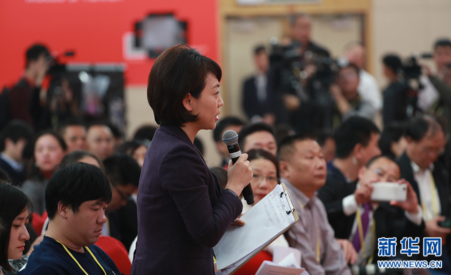 10月26日上午10:00,中國共產黨第十九次全國代表大會新聞發(fā)言人在梅地亞賓館二層新聞發(fā)布廳召開專題新聞發(fā)布會,請有關方面負責人解讀十九大報告,并回答記者關心的問題。圖為中央電視臺記者提問。新華網(wǎng) 翟子赫 攝