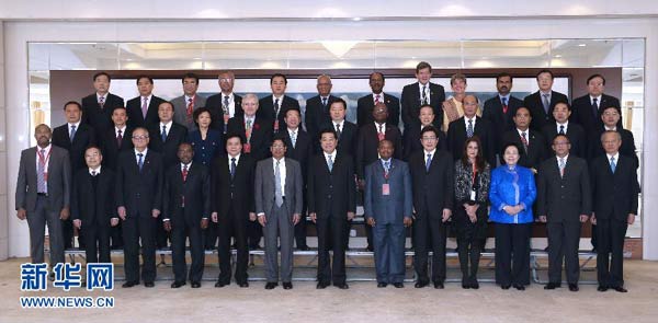 紀念大會開始前,賈慶林會見了出席大會的各國部長、駐華使節(jié)和國際組織負責人。