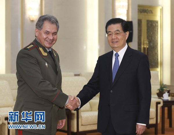 11月21日,國(guó)家主席胡錦濤在北京會(huì)見俄羅斯國(guó)防部長(zhǎng)紹伊古。新華社記者蘭紅光攝