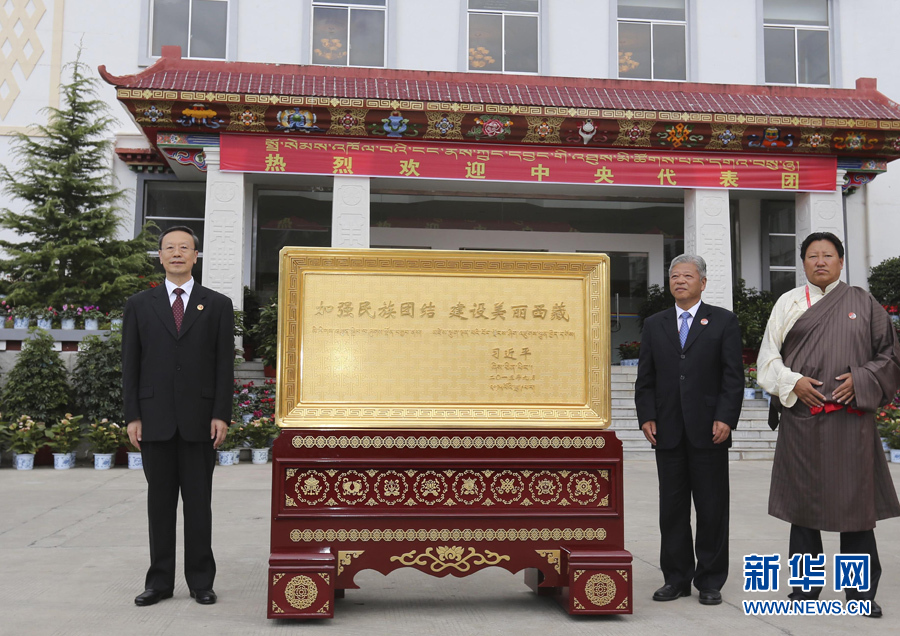 ??? 9月9日至10日,中央書記處書記、全國政協(xié)副主席、中央代表團副團長杜青林率林芝分團,帶著以習近平同志為總書記的黨中央對西藏各族人民的深切關懷和全國人民的美好祝福,看望慰問當地各族干部群眾。這是9月10日,杜青林向林芝市贈送習近平總書記題詞“加強民族團結 建設美麗西藏”賀匾。 新華社記者丁林攝