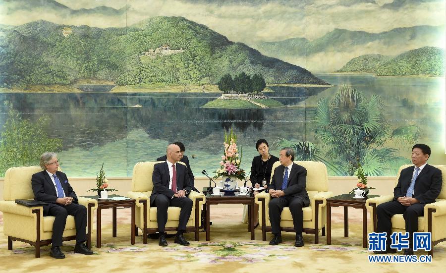 ??? 9月30日,國務(wù)院副總理馬凱在北京人民大會堂會見來訪的瑞士聯(lián)邦委員兼內(nèi)政部長阿蘭·貝爾塞一行。 新華社記者 張鐸 攝