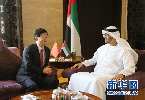 11月7日,在阿聯(lián)酋阿布扎比,習(xí)近平主席特使、中共中央政治局委員、中央政法委書記孟建柱(左)會(huì)見阿聯(lián)酋阿布扎比王儲(chǔ)穆罕默德。新華社記者李震攝