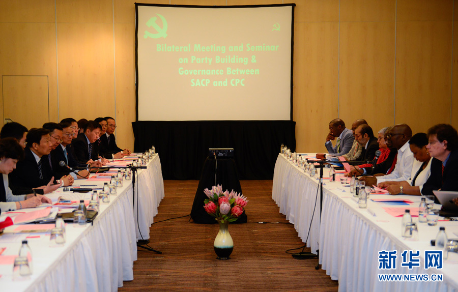 ??? 11月22日,中共中央政治局委員、國家副主席李源潮(左三)在南非開普敦會見南非共產(chǎn)黨第二副總書記索利·馬派拉(右三)。新華社記者翟健嵐攝