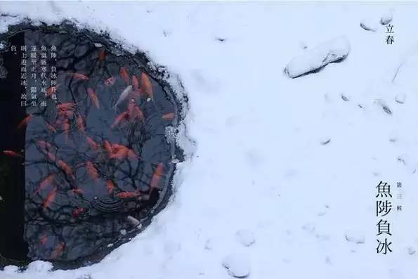 再過五日,河里的冰開始融化,魚開始到水面上游動,此時水面上還有沒完全溶解的碎冰片,如同被魚負(fù)著一般浮在水面。