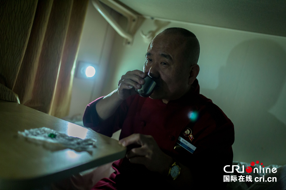 晚上11點多,大部分旅客已進(jìn)入夢鄉(xiāng),白振慶師傅終于可以回到休息室稍作調(diào)整,但只能小睡幾個小時,凌晨4點白師傅還要起來為旅客準(zhǔn)備早飯。白師傅血壓偏高,每天晚上都要吃藥進(jìn)行控制。