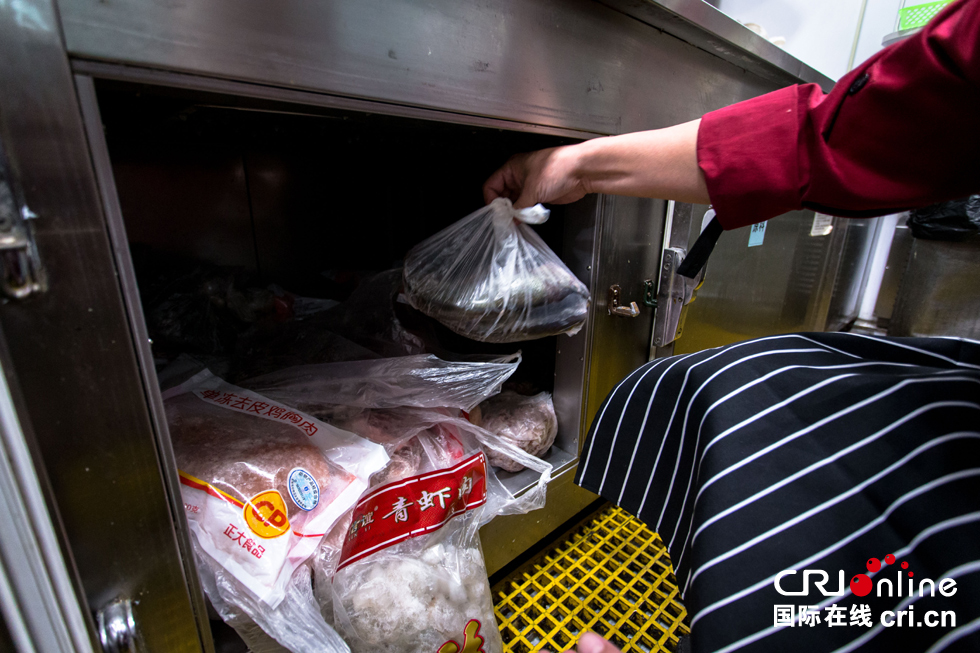 隨旅客一起啟程的還有幾十斤蔬菜、蒸好的兩屜米飯、幾條活魚和一些鮮蝦。在這14個小時的旅途中,廚師長白振慶和他的老搭檔將用這些食材,在只有幾平米的廚房內(nèi)盡可能烹調(diào)出可口的菜肴。圖為白振慶師傅檢查備品情況。