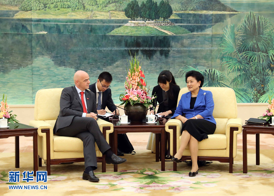 6月14日,國務院副總理劉延東在北京人民大會堂會見來華訪問的國際足聯(lián)主席因凡蒂諾。 新華社記者劉衛(wèi)兵攝