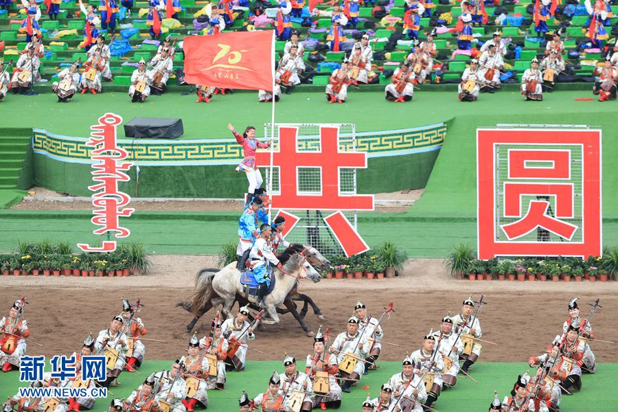 8月8日,內(nèi)蒙古自治區(qū)成立70周年慶祝大會在呼和塔拉內(nèi)蒙古少數(shù)民族群眾文化體育運(yùn)動中心舉行。圖為群眾行進(jìn)表演。新華網(wǎng)記者 陳杰 攝