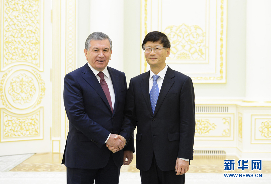 9月9日,中共中央政治局委員、中央政法委書(shū)記、中國(guó)和烏茲別克斯坦政府間合作委員會(huì)中方主席孟建柱(右)在塔什干會(huì)見(jiàn)烏總統(tǒng)米爾濟(jì)約耶夫。 新華社記者沙達(dá)提攝