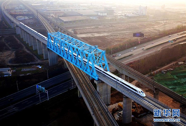 西成高鐵由西安北站駛出的列車經(jīng)過西成高鐵跨西寶高鐵特大橋(12月6日攝)。新華社記者 劉瀟 攝