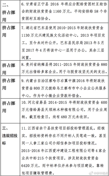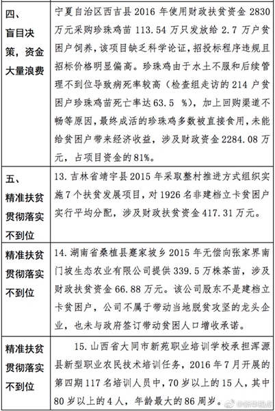 “發(fā)現(xiàn)一起、查處一起、絕不姑息!”財政部監(jiān)督檢查局有關(guān)負(fù)責(zé)人指出,此次檢查發(fā)現(xiàn)了一批違法違規(guī)問題,本著“零容忍”態(tài)度已進(jìn)行了嚴(yán)肅處理。從檢查發(fā)現(xiàn)問題中的一些典型案例看,虛報冒領(lǐng)、擠占挪用、違規(guī)招投標(biāo)、盲目決策導(dǎo)致資金大量浪費、精準(zhǔn)扶貧貫徹落實不到位是當(dāng)前濫用扶貧資金的主要問題所在。