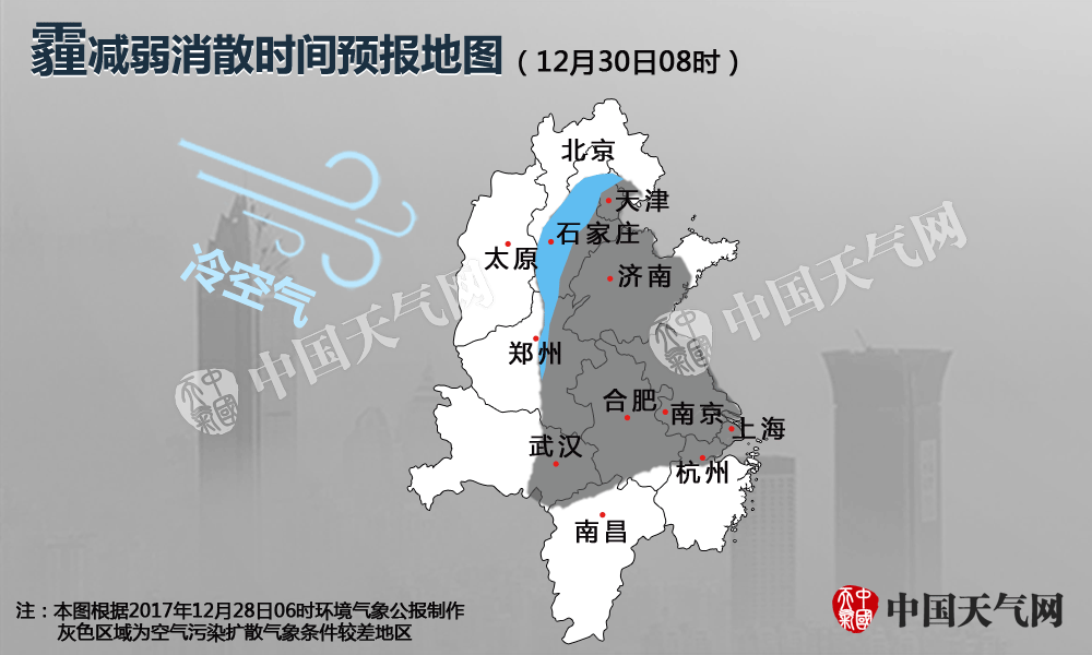 ??本次霾(2017年12月28日-30日)過程減弱消散預(yù)報(bào)圖。(稿件內(nèi)圖片來源:新華社、中國(guó)天氣網(wǎng)、視覺中國(guó))