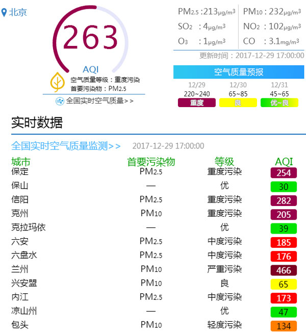 ??? 12月28日,華北黃淮等地迎來霾天氣過程。晚18時(shí),北京市發(fā)布空氣重污染藍(lán)色預(yù)警,污染范圍為2017年冬季之最。