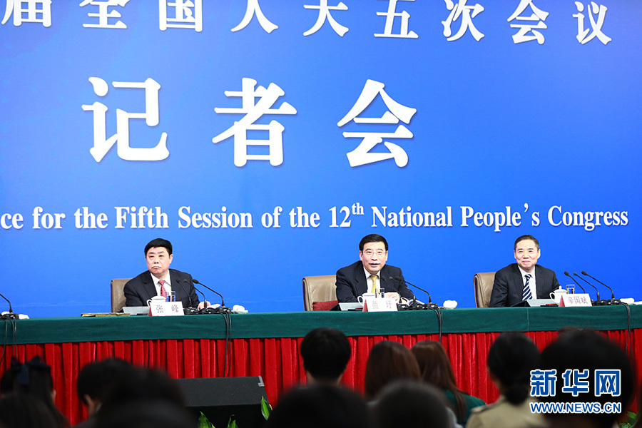 3月11日,十二屆全國人大五次會議新聞中心舉行記者會,邀請工業(yè)和信息化部部長苗圩、副部長辛國斌和總工程師、新聞發(fā)言人張峰就“推進(jìn)實施‘中國制造2025’”的相關(guān)問題回答中外記者的提問。圖為記者會現(xiàn)場。新華網(wǎng)/中國政府網(wǎng) 傅義洲 攝