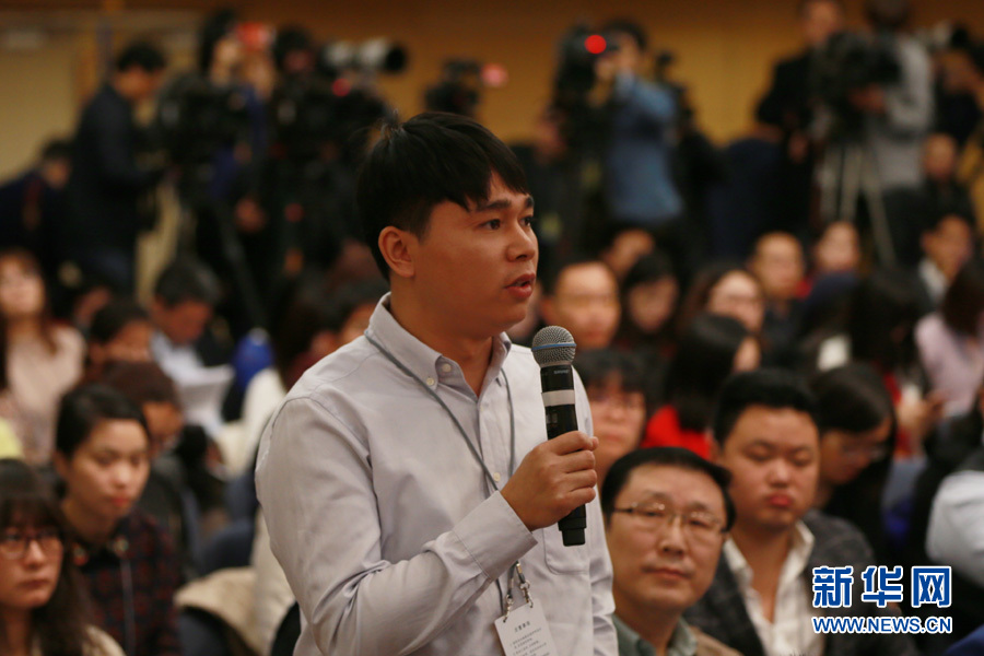 3月14日,十二屆全國人大五次會議新聞中心舉行記者會,邀請國家質檢總局局長支樹平、副局長兼國家認證認可監(jiān)督管理委員會主任孫大偉、國家標準化管理委員會主任田世宏就“質量提升”的相關問題回答中外記者的提問。圖為光明日報記者提問。新華網/中國政府網 傅義洲 攝?