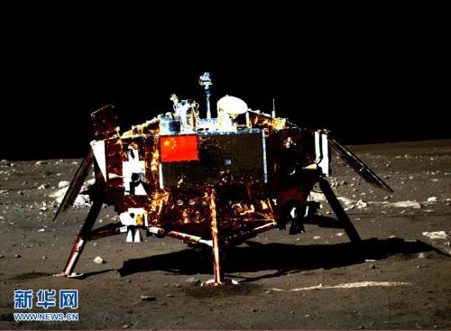 資料圖:嫦娥三號著陸器及器載五星紅旗圖片。該圖是由月球車上全景相機拍攝的。新華社發(fā)(國防科工局供圖) 圖片來源:新華網(wǎng)