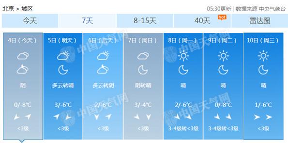 今天氣溫將處于冰點(diǎn)以下,明起稍有回升。北京市氣象臺(tái)預(yù)計(jì),今晨上班時(shí)多云,北轉(zhuǎn)南風(fēng)二三間四級(jí),-5~-3℃;白天多云轉(zhuǎn)陰,北轉(zhuǎn)南風(fēng)二三間四級(jí),最高氣溫僅0℃,為本周最低點(diǎn);夜間陰轉(zhuǎn)多云,西部山區(qū)有零星小雪,南轉(zhuǎn)北風(fēng)一二級(jí),最低氣溫-8℃,晝夜溫差達(dá)到8℃。明天開始至周日最高氣溫將回升到2~3℃,但到下周初又將再次回落至冰點(diǎn)。