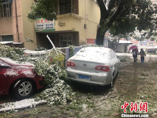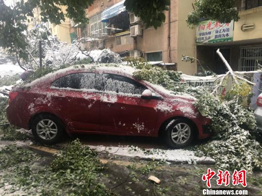 合肥一小區(qū)內(nèi),樹枝被積雪壓斷,砸在路邊停靠的車輛上?!≮w強(qiáng) 攝