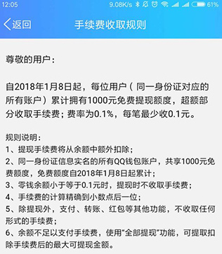 記者從騰訊QQ獲悉,自2018年1月8日起,QQ錢包每位用戶(同一身份證對應(yīng)的所有賬戶)累積擁有1000元免費提現(xiàn)額度,超額部分收取手續(xù)費,費率為0.1%,每筆最少收0.1元。該收費標(biāo)準(zhǔn)與微信支付規(guī)則相同。另外,除提現(xiàn)外,支付、轉(zhuǎn)賬、紅包等其他功能,不收取任何形式的手續(xù)費。