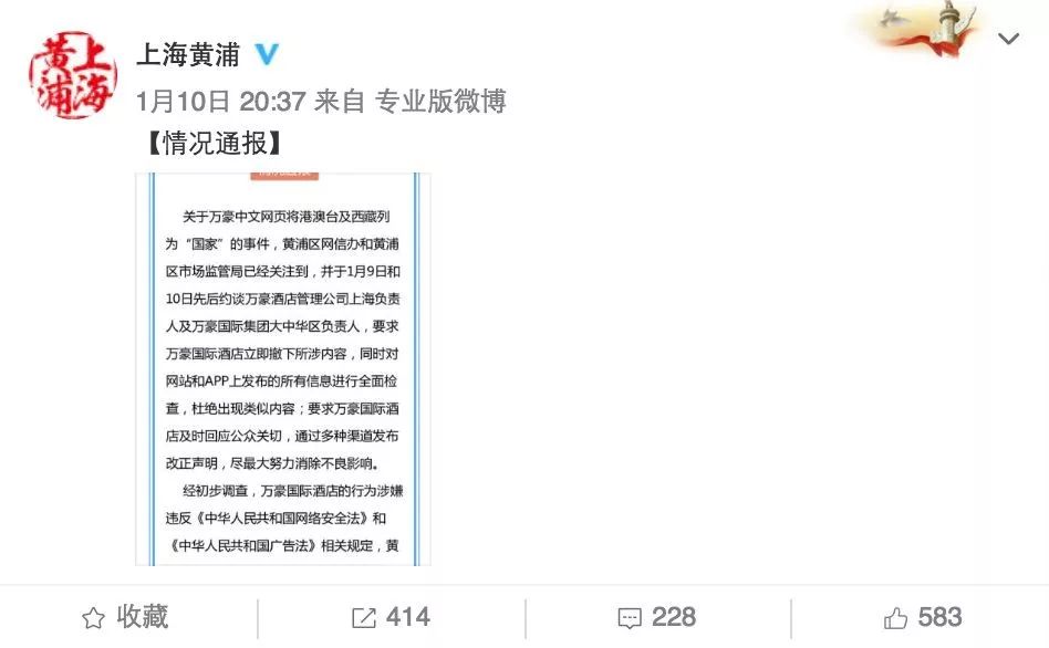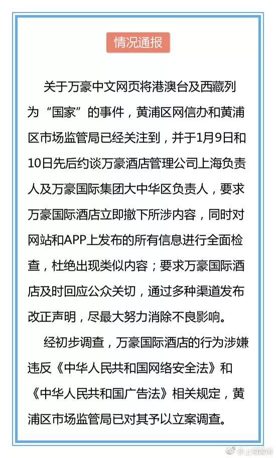 已經(jīng)約談萬豪酒店管理公司上海負(fù)責(zé)人及萬豪國(guó)際集團(tuán)大中華區(qū)負(fù)責(zé)人,要求萬豪國(guó)際酒店立即撤下所涉內(nèi)容,同時(shí)對(duì)網(wǎng)站和APP上發(fā)布的所有信息進(jìn)行全面檢查,杜絕出現(xiàn)類似內(nèi)容;