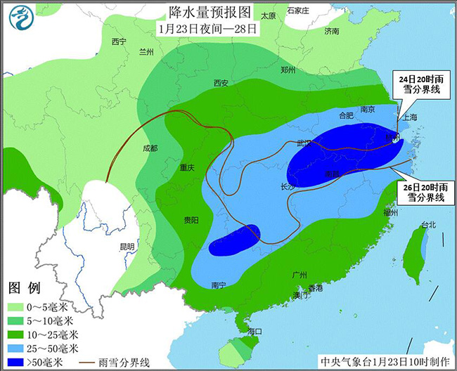 預(yù)計(jì),直至28日,西北地區(qū)東部、黃淮西部和南部、江淮、江漢、江南北部等地先后有中到大雪或雨夾雪,其中陜西東南部、河南南部、湖北大部、安徽、江蘇南部、浙江西北部等地的部分地區(qū)有暴雪,局地大暴雪;貴州、湖南、湖北等地部分地區(qū)有凍雨。其中,降雪集中時段在1月24日-25日、27日。