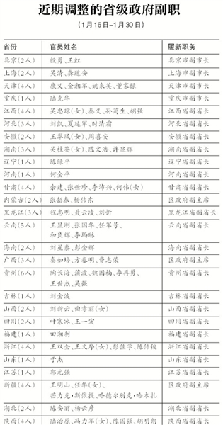 新京報(bào)記者梳理發(fā)現(xiàn),自1月16日以來(lái),27個(gè)省份共調(diào)整省級(jí)政府副職70名。