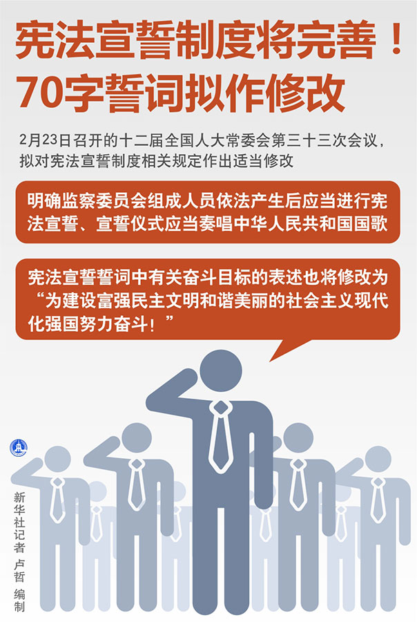 新華社北京2月23日電(記者陳菲、王琦)23日召開的十二屆全國人大常委會第三十三次會議,擬對憲法宣誓制度相關規(guī)定作出適當修改,明確監(jiān)察委員會組成人員依法產(chǎn)生后應當進行憲法宣誓、宣誓儀式應當奏唱中華人民共和國國歌。憲法宣誓誓詞中有關奮斗目標的表述也將修改為“為建設富強民主文明和諧美麗的社會主義現(xiàn)代化強國努力奮斗!”