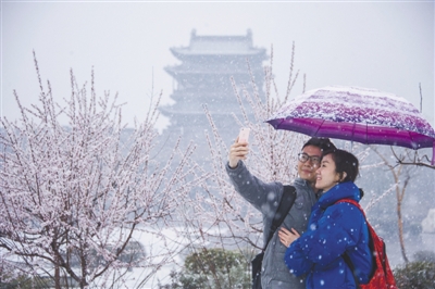 陰晴雨雪關(guān)系百姓生活,因此廣受關(guān)注。圖為日前山西省晉中市平遙縣迎來(lái)降雪天氣,游客在古城門外合影留念。梁生仁攝(新華社發(fā))