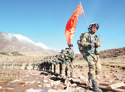 昌都是反分裂斗爭的前沿和主陣地。作為支隊(duì)全域式機(jī)動(dòng)處置力量,要想成為執(zhí)勤處突的“尖刀”,就必須付出極大的努力。中隊(duì)原隊(duì)長趙治國說:“按照源于實(shí)戰(zhàn)、高于實(shí)戰(zhàn)、嚴(yán)于實(shí)戰(zhàn)的要求,中隊(duì)始終堅(jiān)持每月一次搏擊對(duì)抗、應(yīng)用射擊、長途奔襲,每周三次武裝越野、搶占山頭、障礙訓(xùn)練,每人每天100個(gè)俯臥撐、100個(gè)仰臥起坐、100個(gè)馬步?jīng)_拳、100個(gè)深蹲起立、100個(gè)立位體前屈,全面錘煉官兵的反恐作戰(zhàn)技能。”