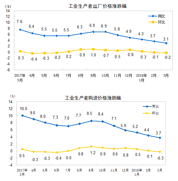 2018年3月份,全國工業(yè)生產(chǎn)者出廠價(jià)格同比上漲3.1%,環(huán)比下降0.2%。工業(yè)生產(chǎn)者購進(jìn)價(jià)格同比上漲3.7%,環(huán)比下降0.3%。一季度,工業(yè)生產(chǎn)者出廠價(jià)格同比上漲3.7%,工業(yè)生產(chǎn)者購進(jìn)價(jià)格同比上漲4.4%。