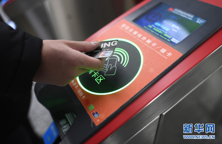 乘客在杭州地鐵豐潭路站體驗(yàn)使用帶有閃付功能的銀聯(lián)IC卡過(guò)閘乘車(2017年12月27日攝)。新華社記者 黃宗治 攝